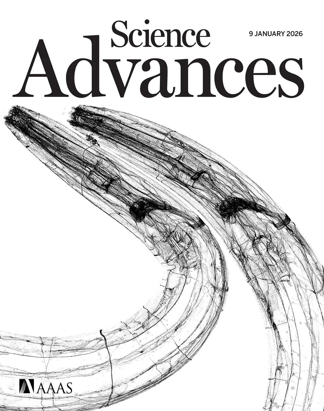 Lateral view of nematode C. elegans larvae, with endogenously labelled b-spectrin/UNC-70 (pictured in black). The cover of the January 9 issue of Science Advances. Credit: Igor Bonacossa-Pereira.
